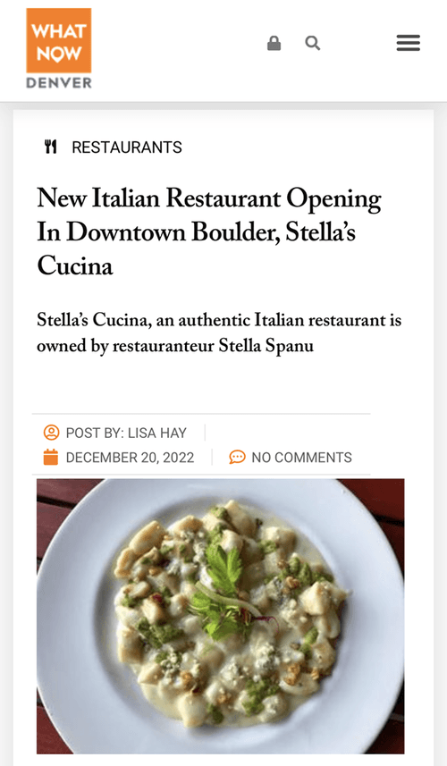Stella’s Cucina between the 30 recommended restaurants, alongside Colorado’s five Michelin Star restaurants.